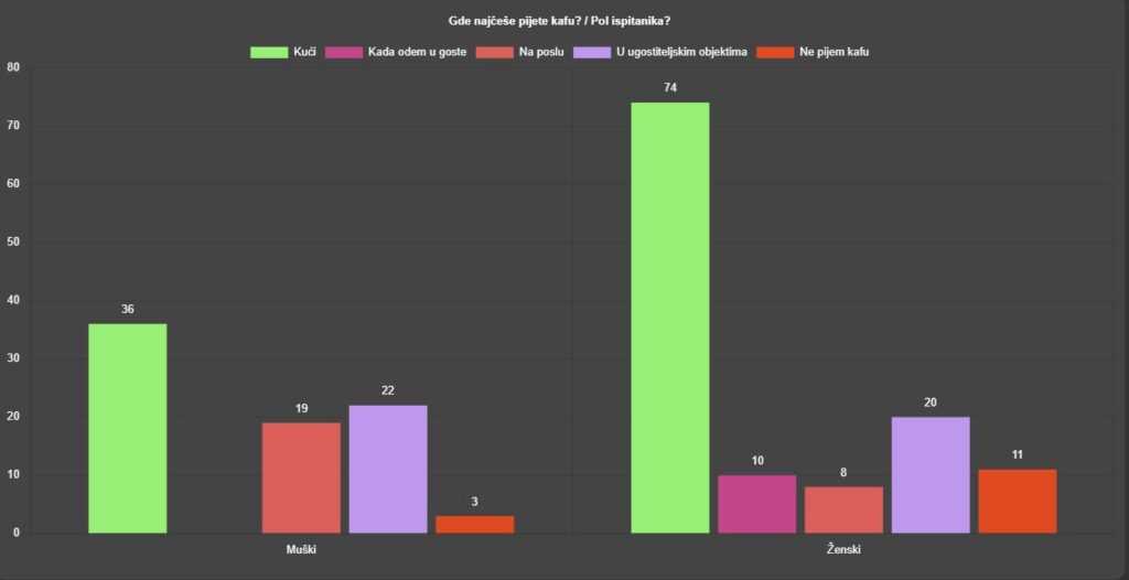 U okviru ankete na prigodnom uzorku od 204 ispitanika želeli smo da utvrdimo da li postoji statistički značajna povezanost između pola ispitanika i mesta na kojem piju kafu.