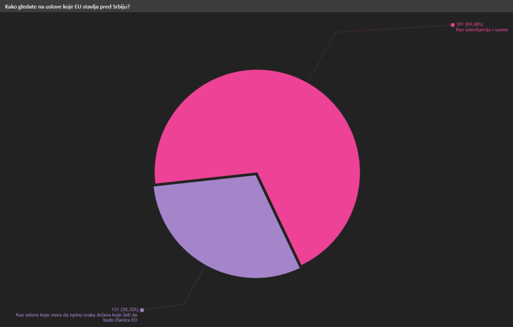 Anketa sprovedena na prigodnom uzorku od 432 ispitanika pokazuje da većina građana uslove za članstvo u Evropskoj uniji vidi kao ucene, dok manji deo ispitanika smatra da su oni prilika za sprovođenje reformi.