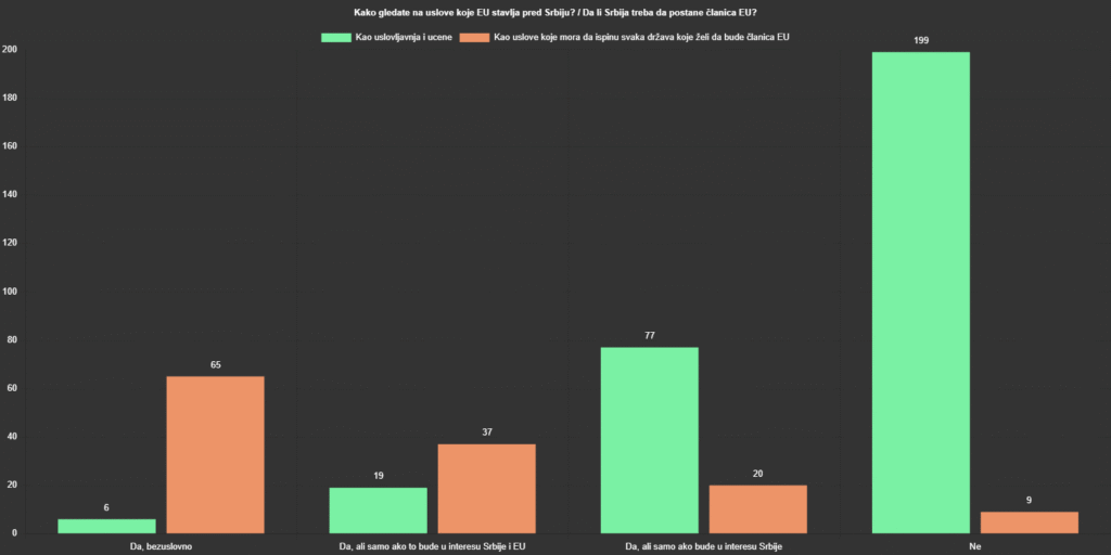 Ispitanici koji podržavaju članstvo Srbije u EU uslove za pristupanje uglavnom vide kao zahteve za sprovođenje reformi, dok oni koji su protiv članstva te iste uslove doživljavaju kao ucene i uslovljavanja