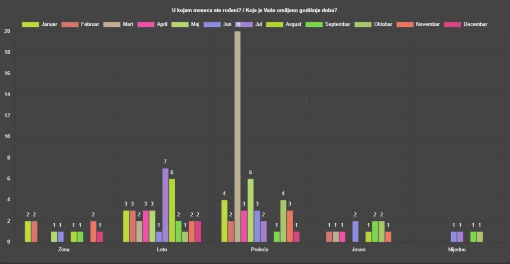 Od 110 ispitanika, najveći broj je naveo da im je omiljeno godišnje doba upravo ono u kojem su rođeni. Statistička analiza ukazuje da postoji značajna povezanost između ove dve varijable (Pearson Chi-Square = 64.131; df = 44; p = 0.025).