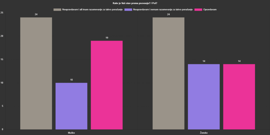 U istraživanju koje je sprovedeno na prigodnom uzorku od 105 ispitanika, utvrđeno je da ne postoji statistički značajna povezanost između pola i stava prema psovanju (Pearson Chi-Square = 1.415, df = 2, p = 0.493).