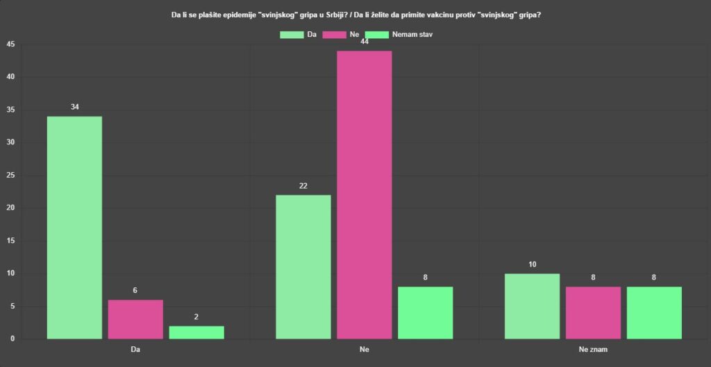 Anketa sprovedena na prigodnom uzorku od 142 ispitanika pokazala je da tokom pandemije A (H1N1) postojala statistički značajna povezanost između straha od virusa tzv. „svinjskog gripa“ i motivacije za vakcinaciju (Pearson Chi-Square = 38.735; df = 4; p = 0.000).